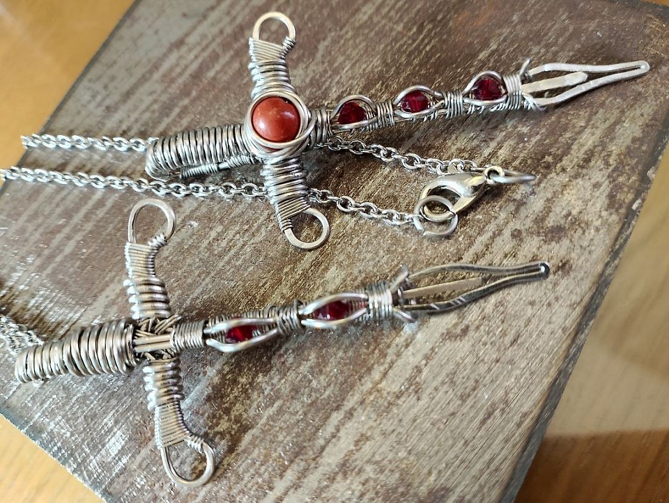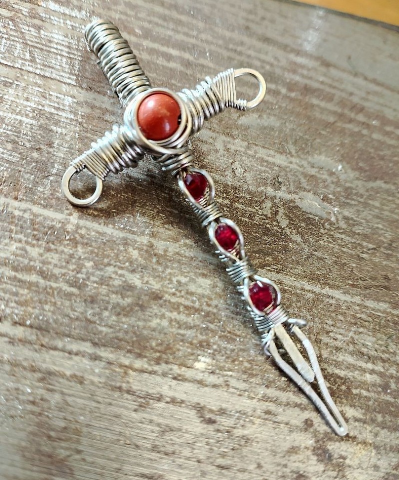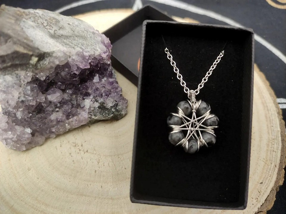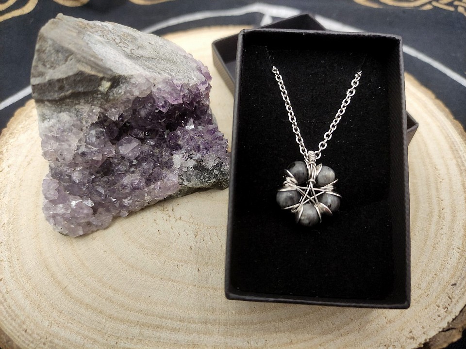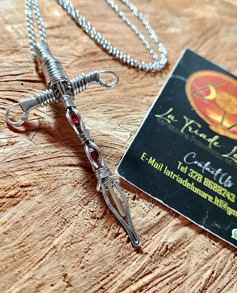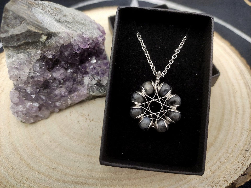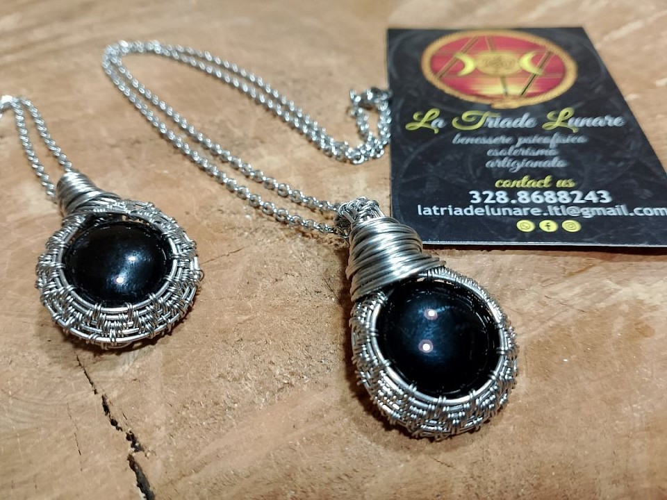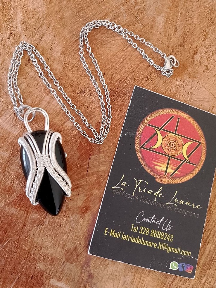 L' onice nera, avvolto magistralmente in wire-wrapping, รจ una pietra legata all' energia saturnina e gode di molte proprietร :ย