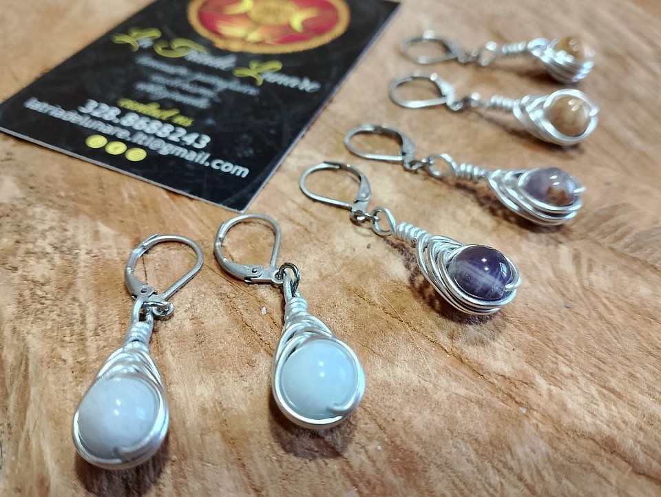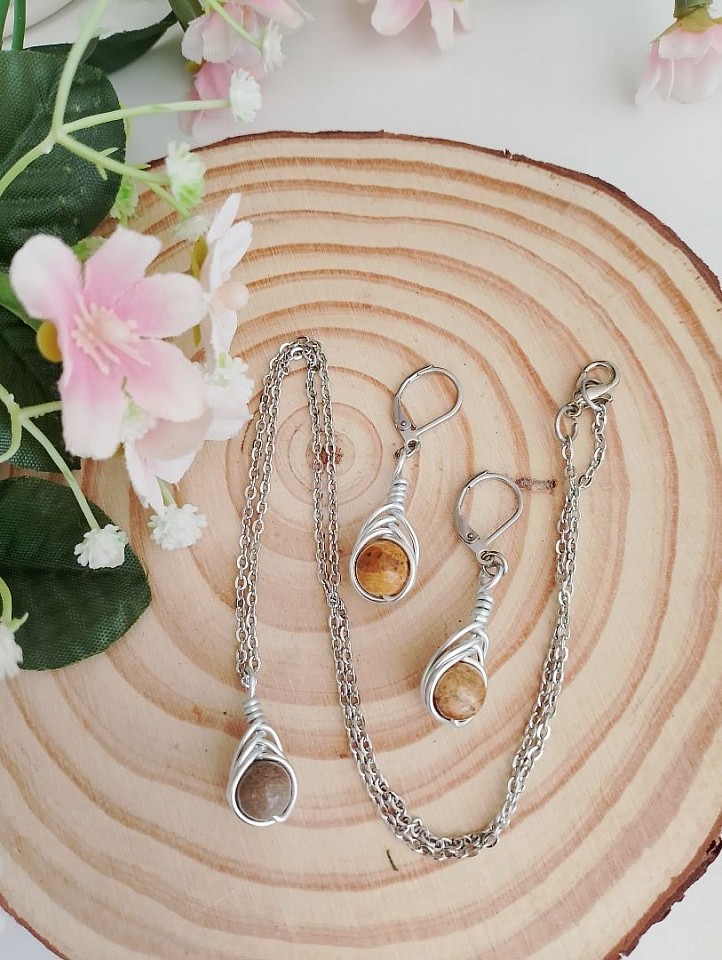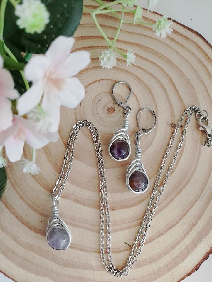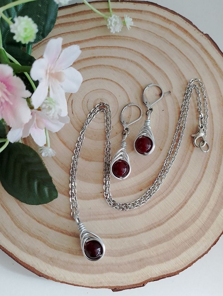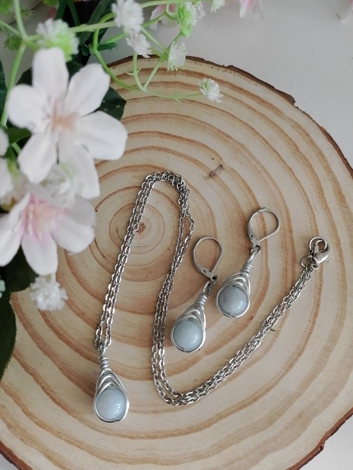 Collana e orecchini Drop realizzati a mano con alluminio, pietre naturali e acciaio inossidabile.